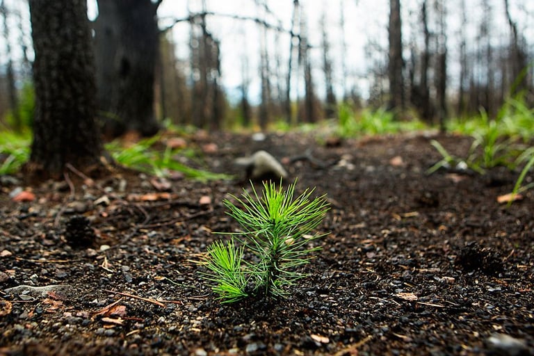 Seeds of many species often lie dormant within the layers of a forest floor, some for quite a long time. When a fire comes through, it can create conditions that cause these seeds to germinate, grow and even thrive. Though the scars of the fire remain, out of devastation, a new though somewhat different forest emerges.
