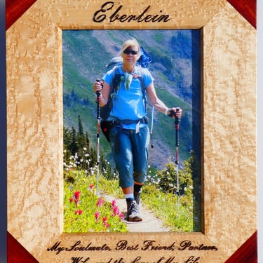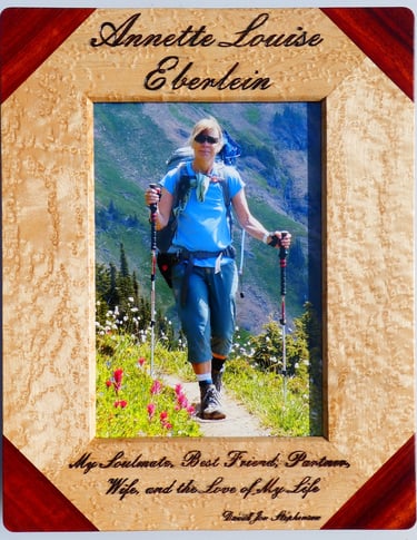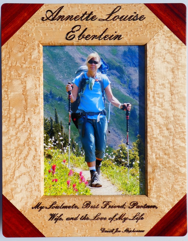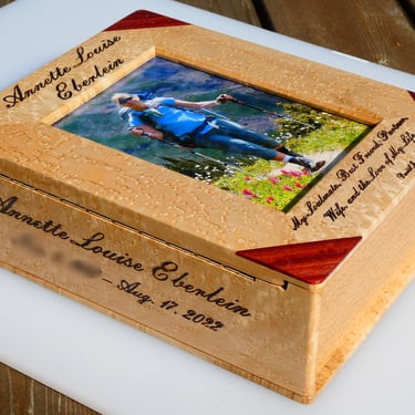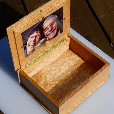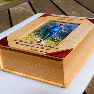 The woods are birdseye maple (front, back and spine), padauk (corners) and red oak (pages). The photo on the front is of her backpacking in the Goat Peaks Wilderness in July 2019. Annette was a librarian and was passionate about early childhood literacy. She spent her last year or so of her career as an Americorps volunteer for United Way of North Idaho developing ready for kindergarten programs, including authoring a book "Launch into Learning" to help parents and caregivers prepare their children for school. For these reasons, the box is designed to look like a book. The photo inside the box was taken in our camper-van in 2021 on her last birthday. We were celebrating with a little Montana Honey Moonshine. I miss her so very much...